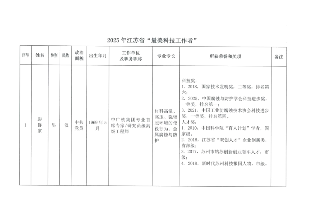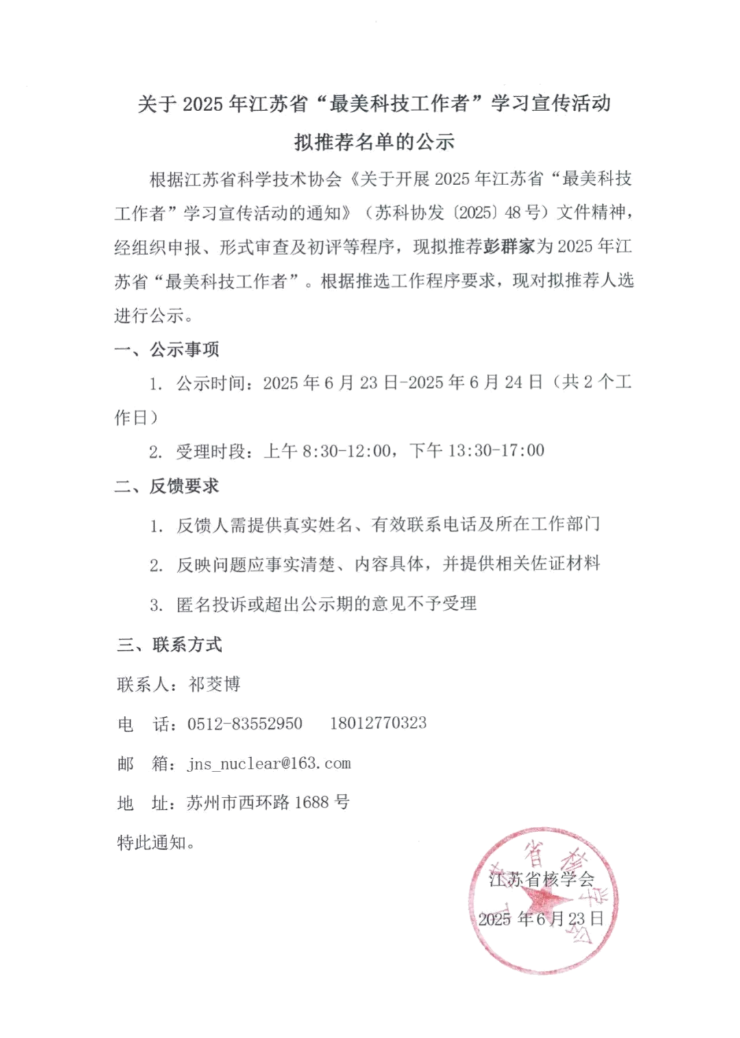 2025年江苏省“最美科技工作者”拟推荐人选的公示